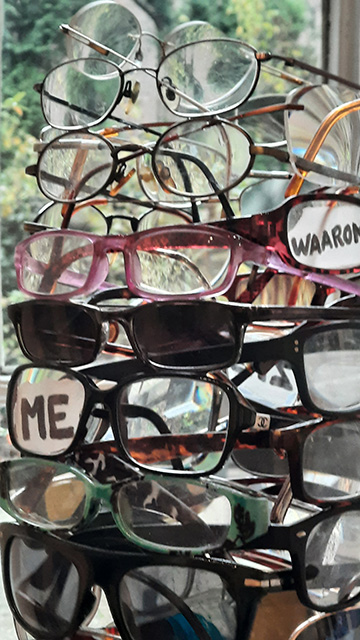 Toren van gebruikte brillen